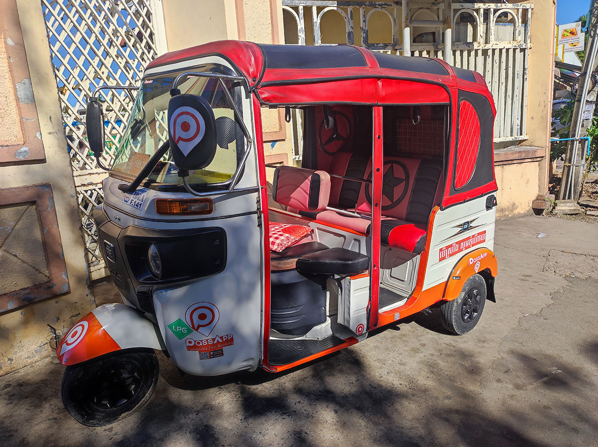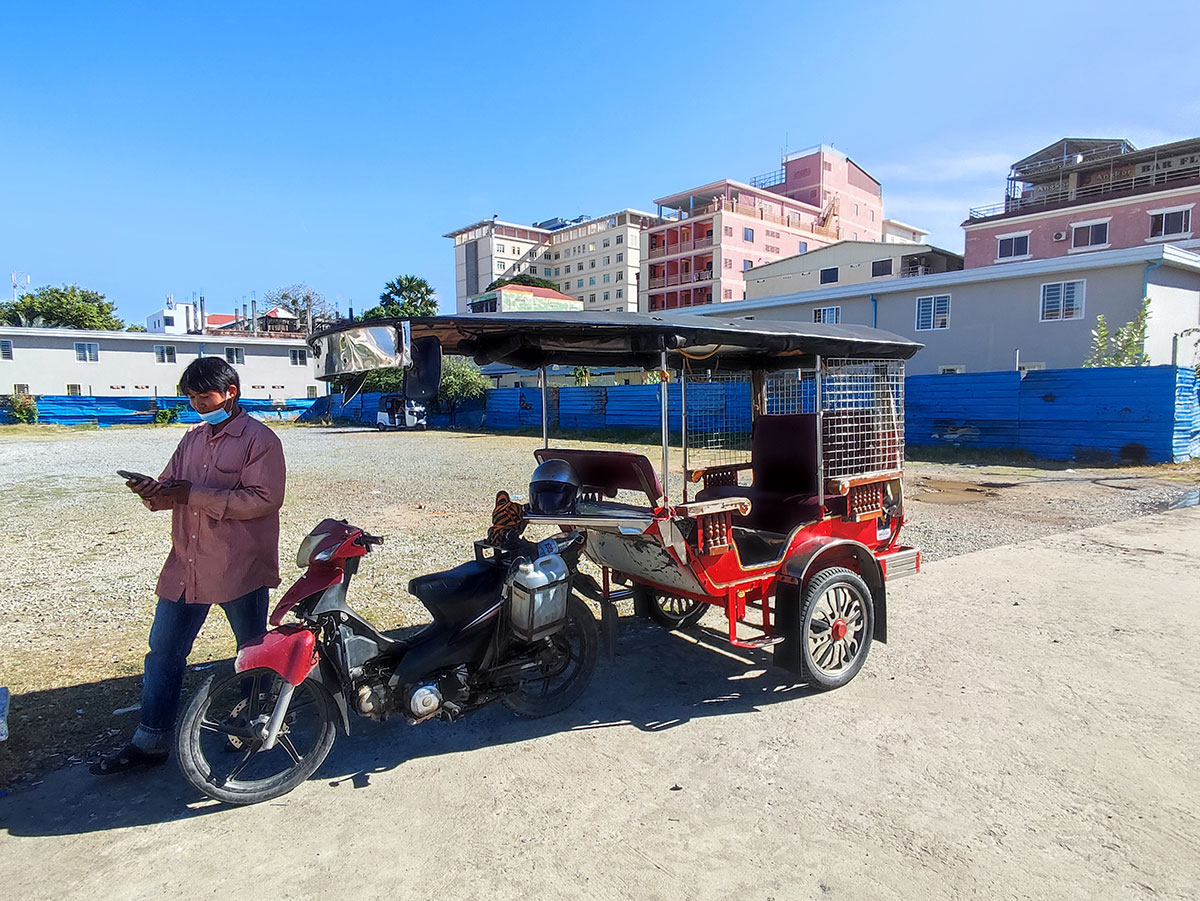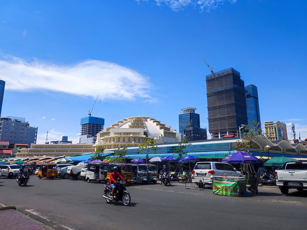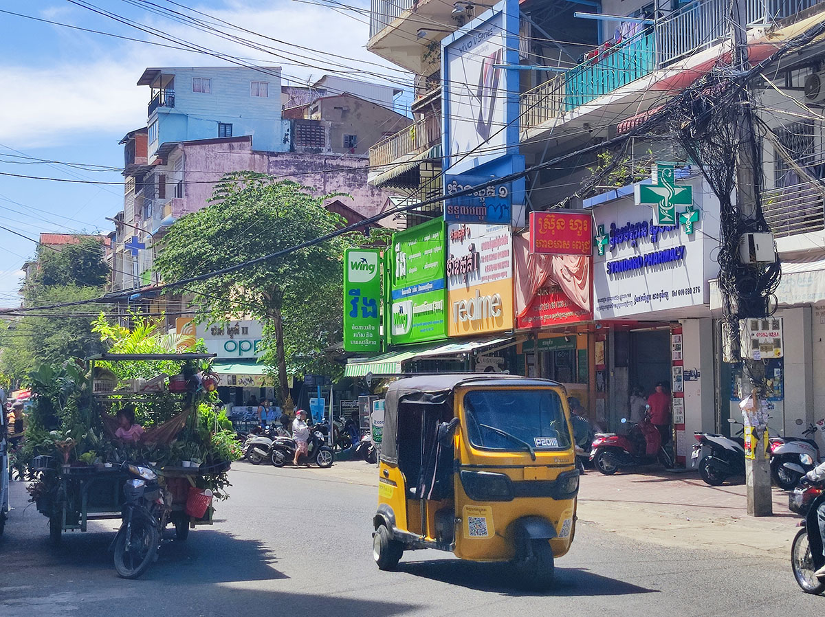 Notre premier étonnement en arrivant ce sont ses immenses buildings contrastants avec la simplicité de la vie des Khmers. Le nombre de Tuk Tuks, de scooters et de grosses cylindrées est bien sûr nettement supérieur à celui de Siem Reap et Battambang. Les grosses voitures ont d’énormes calandres carrés ressemblant au masque de Dark Vador. Dans les carrefours, nous n’avons toujours pas compris qui a la priorité, c’est à celui qui se lance le premier qui passe. Le piéton n’est pas du tout prioritaire ici et a intérêt à avoir de bonnes baskets pour courir. Les Tuk Tuks sont légèrement différents de ceux de Siem Reap. Ici, ils sont customisés avec du simili cuir coloré à l’intérieur et extérieur. Il y en a de très mignons. On rencontre également des Cyclo pousse, de drôles de charettes une place poussées par un vélo.