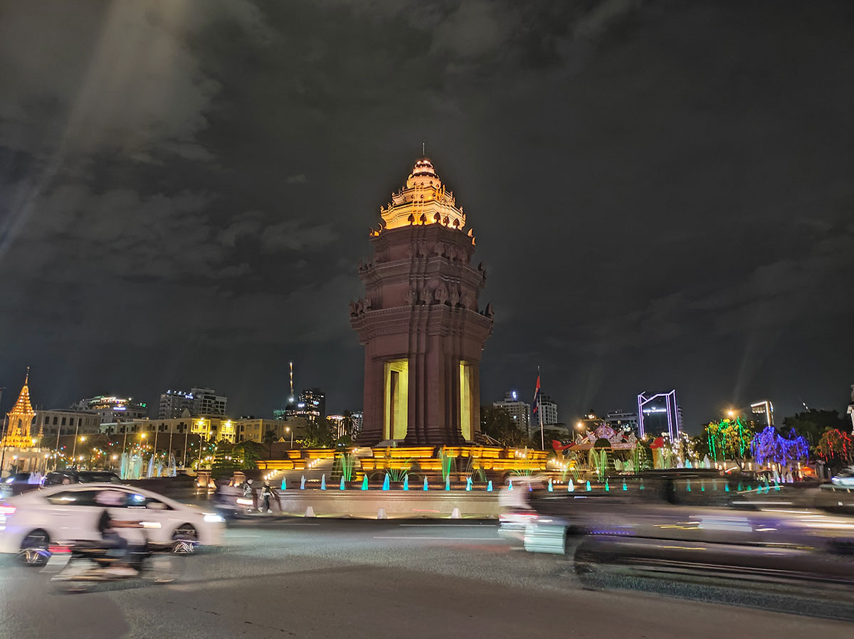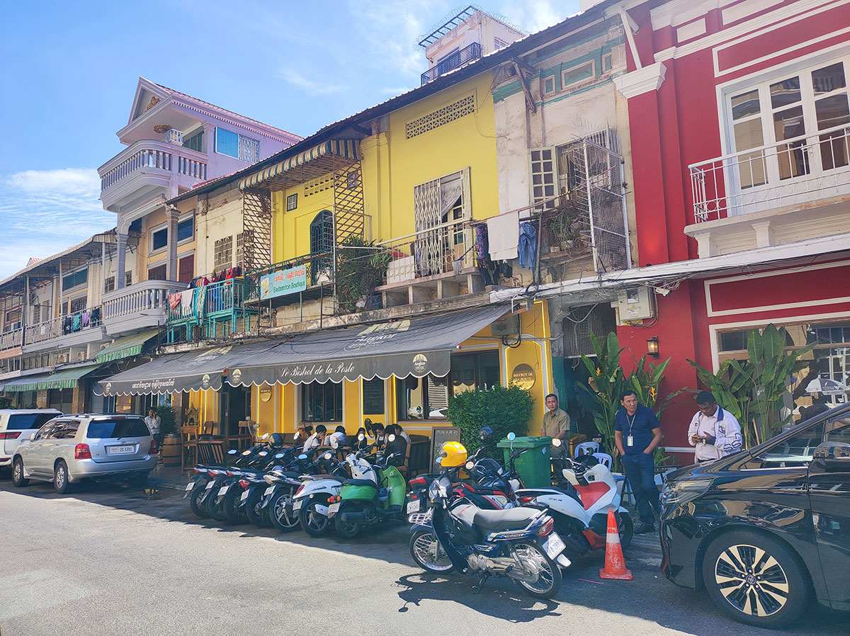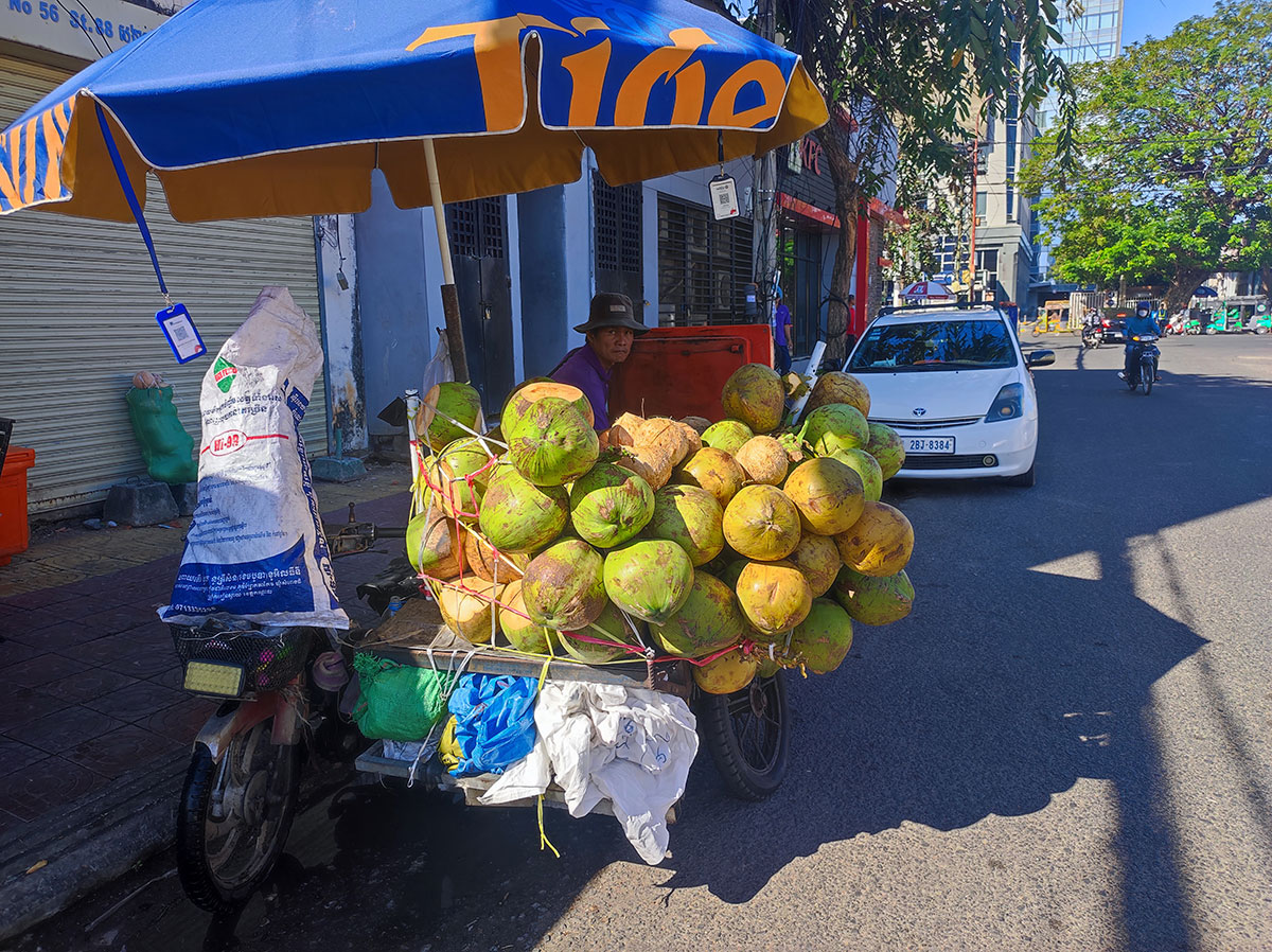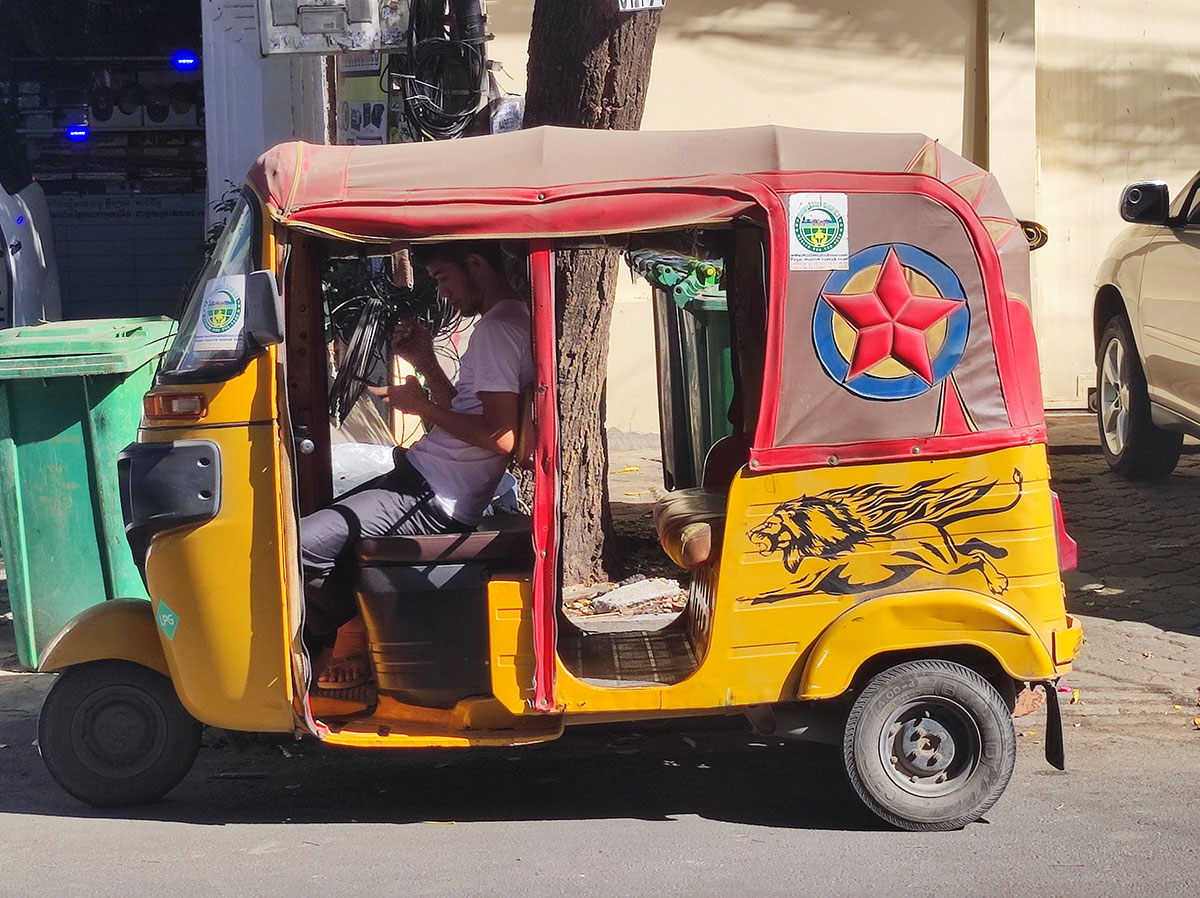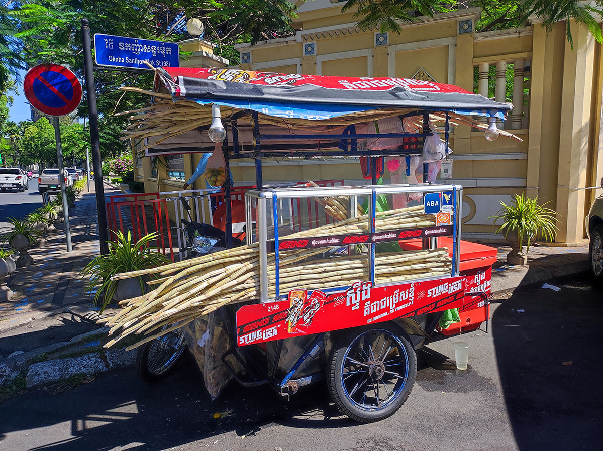 Notre premier étonnement en arrivant ce sont ses immenses buildings contrastants avec la simplicité de la vie des Khmers. Le nombre de Tuk Tuks, de scooters et de grosses cylindrées est bien sûr nettement supérieur à celui de Siem Reap et Battambang. Les grosses voitures ont d’énormes calandres carrés ressemblant au masque de Dark Vador. Dans les carrefours, nous n’avons toujours pas compris qui a la priorité, c’est à celui qui se lance le premier qui passe. Le piéton n’est pas du tout prioritaire ici et a intérêt à avoir de bonnes baskets pour courir. Les Tuk Tuks sont légèrement différents de ceux de Siem Reap. Ici, ils sont customisés avec du simili cuir coloré à l’intérieur et extérieur. Il y en a de très mignons. On rencontre également des Cyclo pousse, de drôles de charettes une place poussées par un vélo.