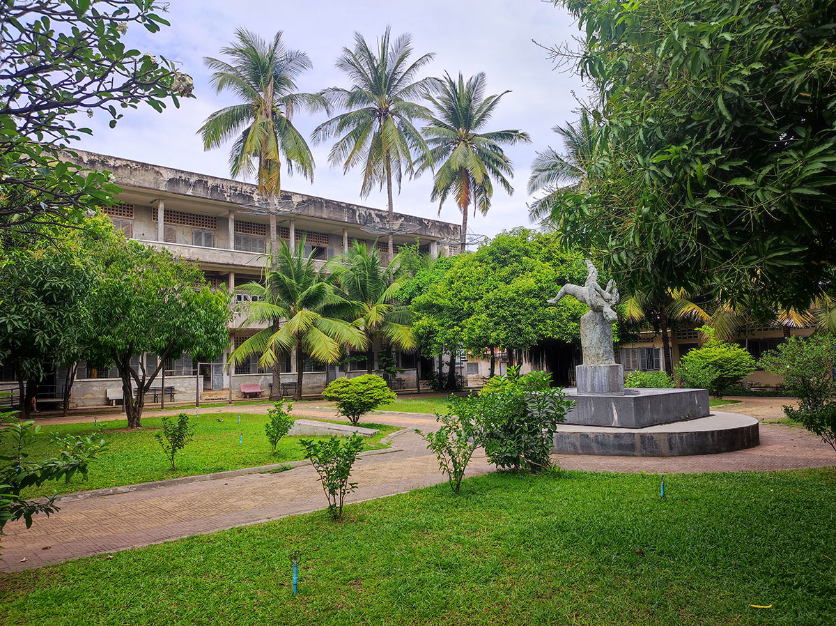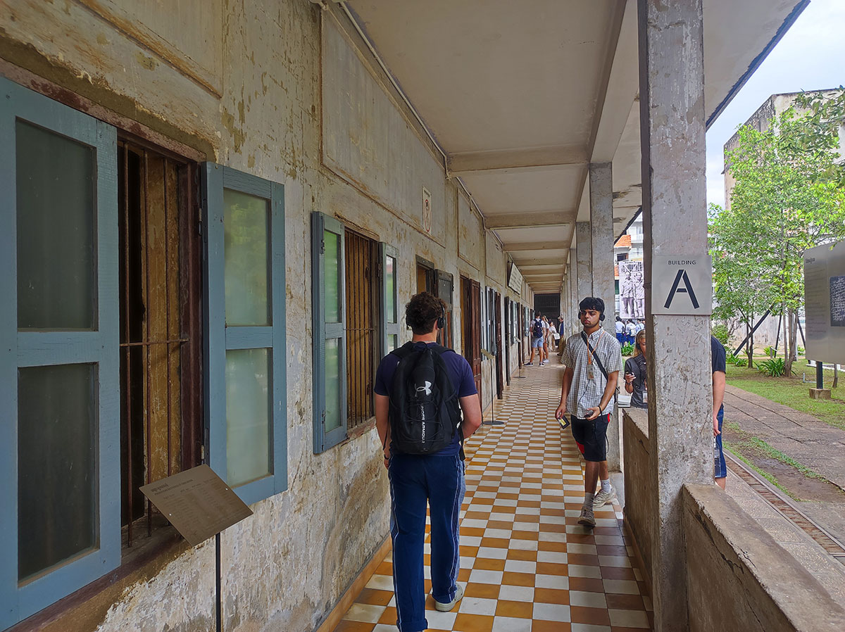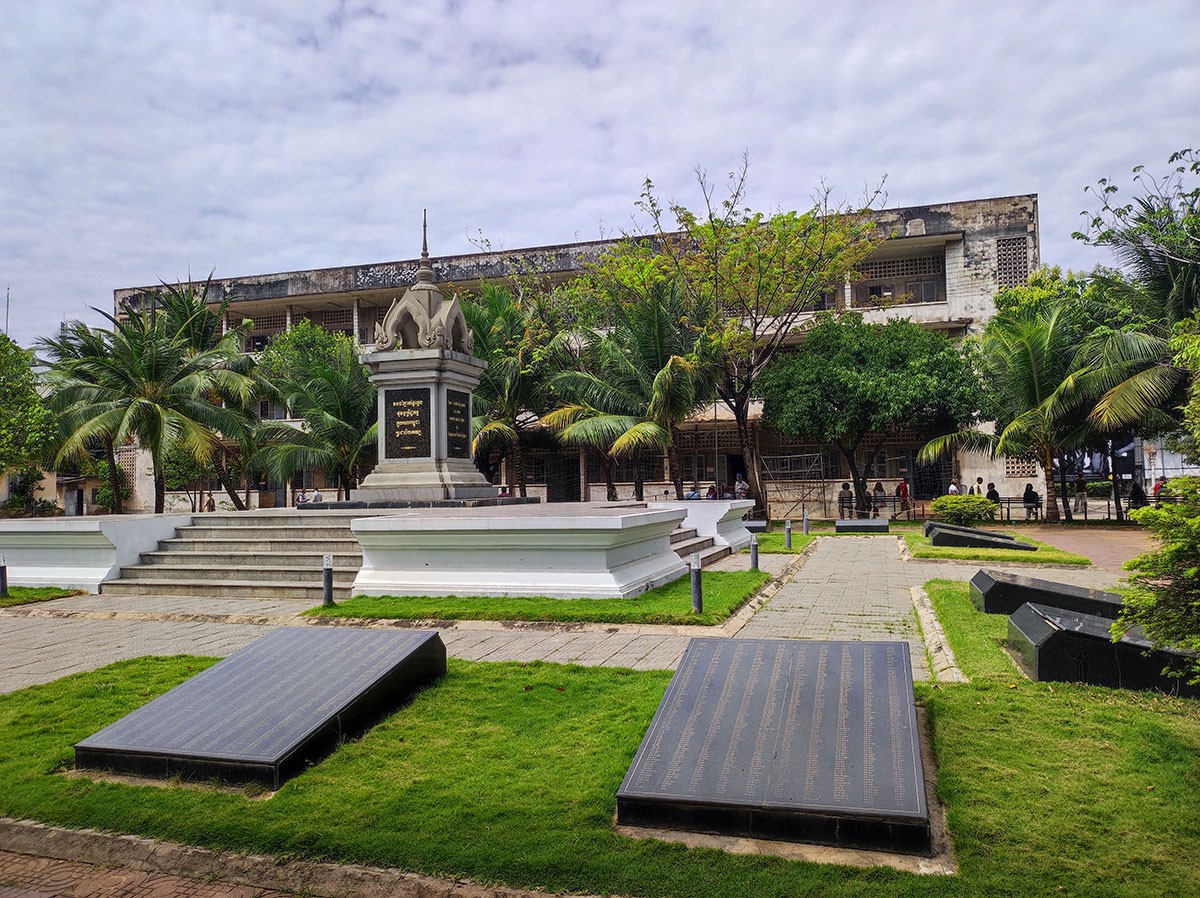 Val ne se sentait pas de venir, j’y suis donc allée seule en Tuk Tuk. Arrivée sur place, tu peux prendre un audio guide super bien fait par un petit fils de déporté. Il existe en de nombreuses langues dont le français. Munie de mon casque et de mon plan, je me laisse guider pas après pas au sein du camp S21 aussi appelé musée du génocide ou Tuol Sleng. La visite commence par la grande cours où de magnifiques frangipaniers en fleurs ombragent les tombes blanches des derniers exécutés dans le camp. L’ambiance est pesante mais à la fois sereine et apaisée. La beauté de cette cours contraste incroyablement avec les horreurs subies ici même. J’y suis allée de bonne heure et c’est parfait pour faire tranquillement le tour sans foule car à 11h de nombreux bus arrivaient.