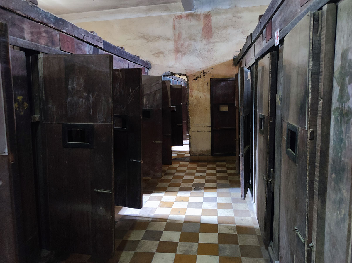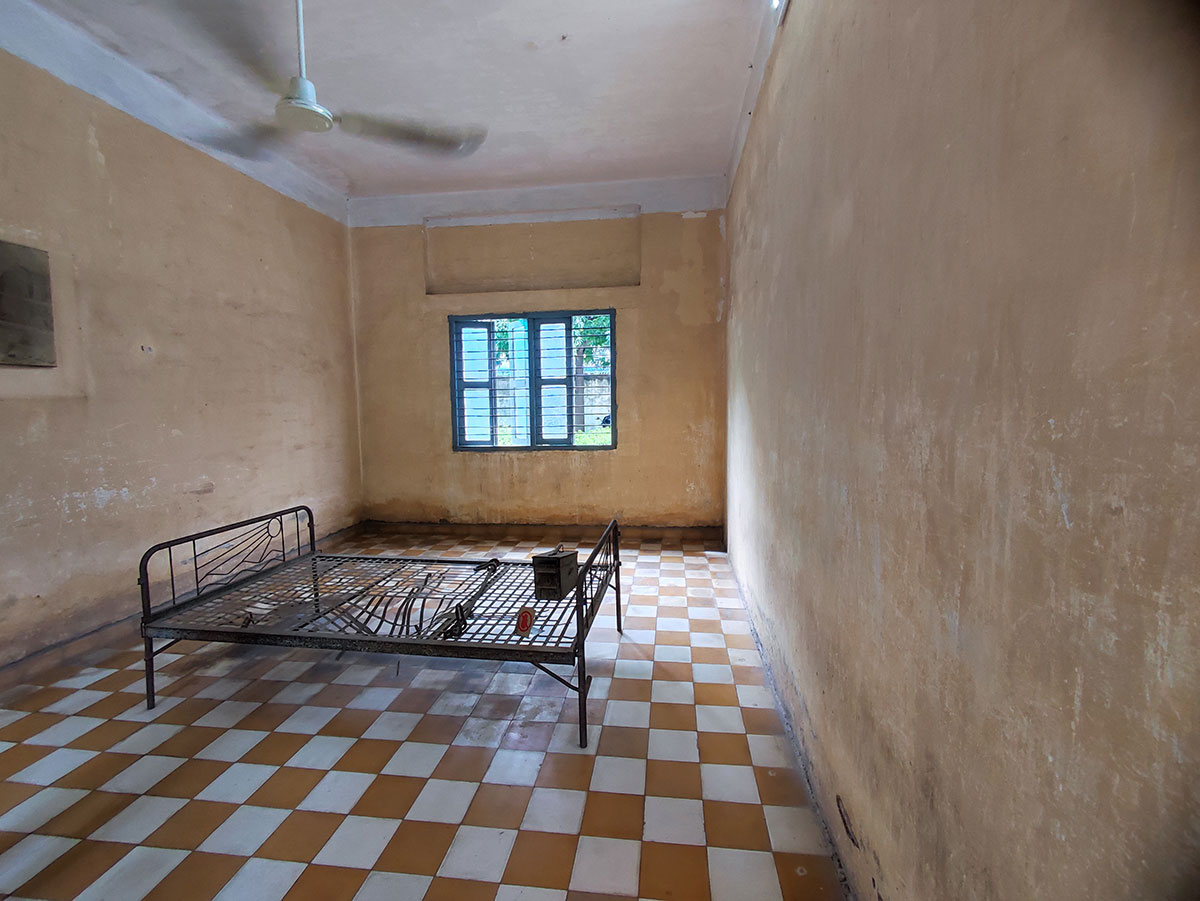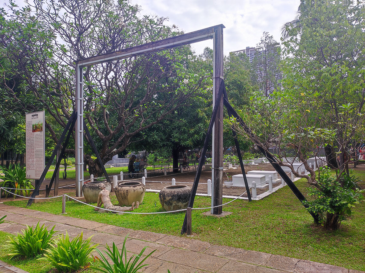 Val ne se sentait pas de venir, j’y suis donc allée seule en Tuk Tuk. Arrivée sur place, tu peux prendre un audio guide super bien fait par un petit fils de déporté. Il existe en de nombreuses langues dont le français. Munie de mon casque et de mon plan, je me laisse guider pas après pas au sein du camp S21 aussi appelé musée du génocide ou Tuol Sleng. La visite commence par la grande cours où de magnifiques frangipaniers en fleurs ombragent les tombes blanches des derniers exécutés dans le camp. L’ambiance est pesante mais à la fois sereine et apaisée. La beauté de cette cours contraste incroyablement avec les horreurs subies ici même. J’y suis allée de bonne heure et c’est parfait pour faire tranquillement le tour sans foule car à 11h de nombreux bus arrivaient.