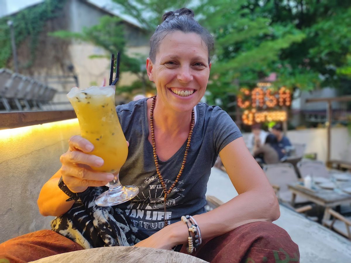 Nous sommes ressorties ce soir prendre un peu le frais, 28 degrés en soirée dans un lieu très sympa le Autumn Bar en face de Khmer Women’s Food. C’est un lieu assez peu connu des touristes, nous étions les seules. Il se situe dans une petite rue que les touristes contournent en passant par la rue perpendiculaire très touristique pour le coup.