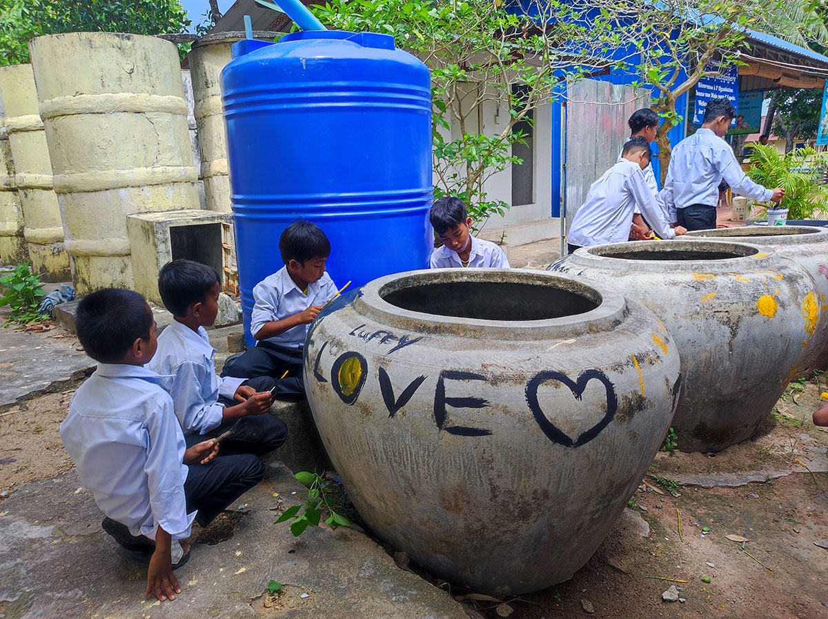 Ensuite, Guillaume propose un atelier décoration des grandes jarres destinées à récupérer l’eau. Les enfants ont laissé libre cours à leur imagination et ont peint des coeurs, des soleils, des étoiles, des coccinelles. Les tables et les bancs de l’école ont eux aussi retrouvé une nouvelle jeunesse. Un atelier confection de fleurs a ensuite été lancé. Les grands comme les petits ont confectionné de belles fleurs.