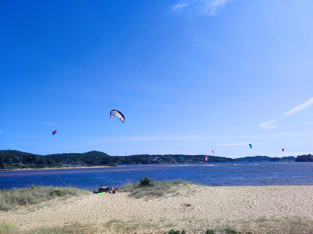 Nous nous sommes ensuite dirigées vers la marina d’Aros où l’on a pu observer les kite surfers s’en donner à coeur joie sur le fjord avec le vent qui s’y engouffre. Faro a bien marché et n’est même pas monté en poussette. Sur la route, on ne s’attendait pas à ce que ça soit autant vallonné en bordure de mer. Ça grimpe et ça descend sec, les routes ne sont pas hyper larges mais Val gère à fond.
