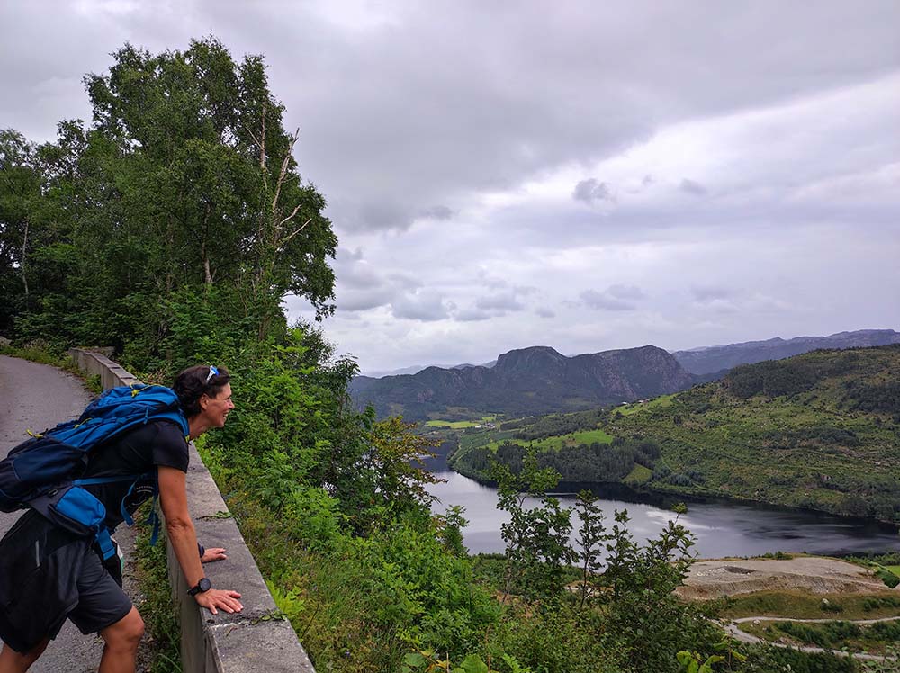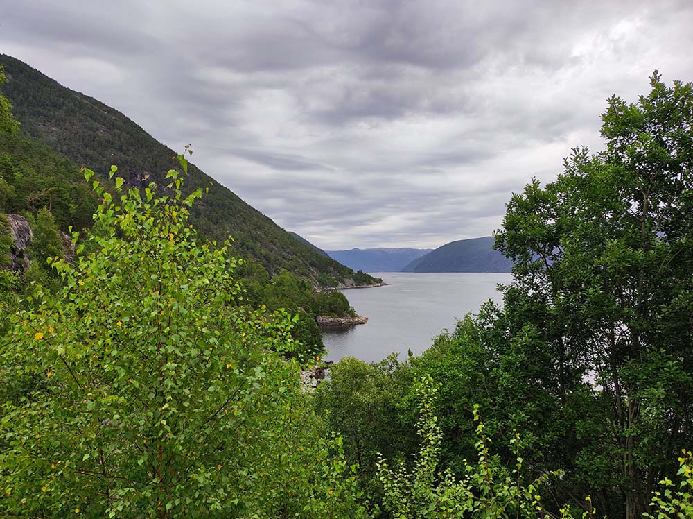 Nous sommes ensuite remontées sur notre fameuse route de la veille pour pouvoir rejoindre la route panoramique Ryfylke 13. Et là, ouahhhhhh !!!!! Ça a été grandiose une autre vue panoramique sur le fjord voisin à Høllesly. On a profité un long moment pour admirer le tableau vivant qu’on avait devant les yeux.