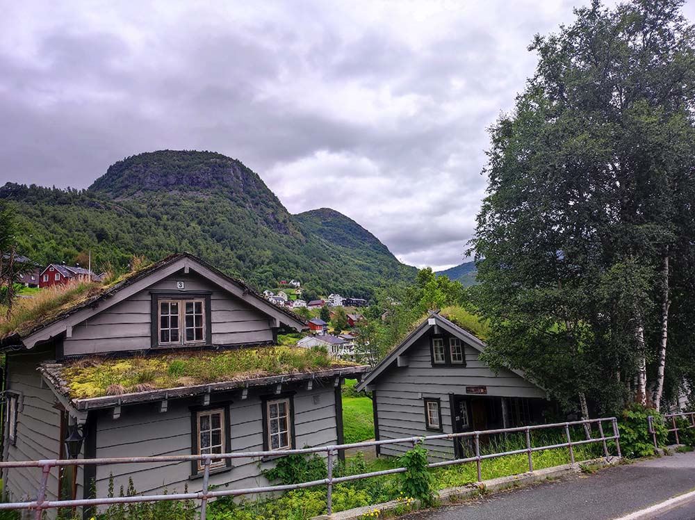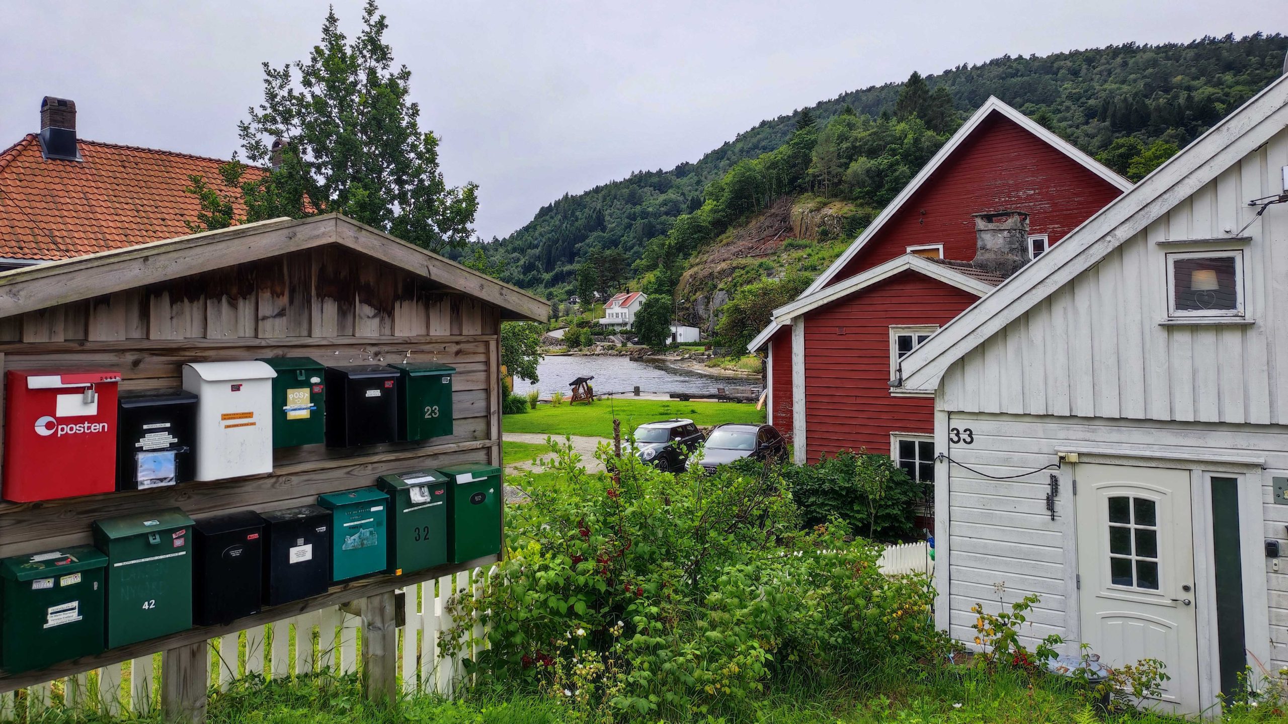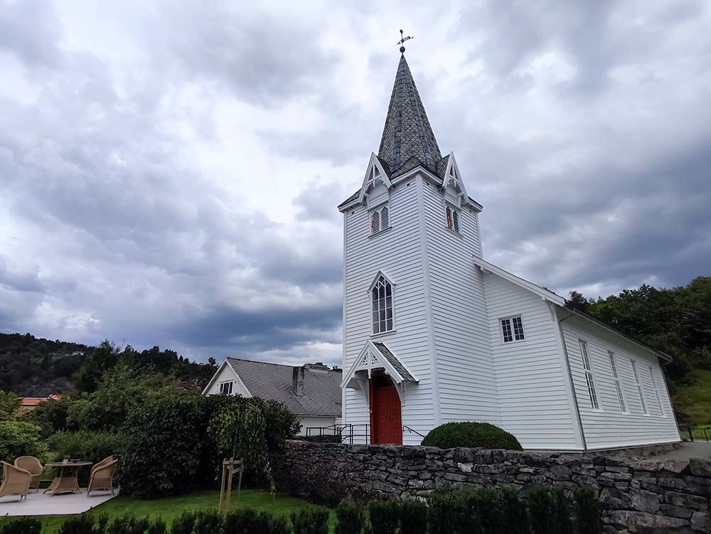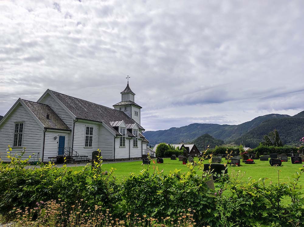 Direction ensuite Feda, un petit village enclavé très mignon. Le soleil n’était pas de la partie mais les couleurs des maisons ont égayé notre visite. Faro a encore bien apprécié aujourd’hui se balader pour voir l’église en bois blanc, le port et les hangars à bateaux rouge.