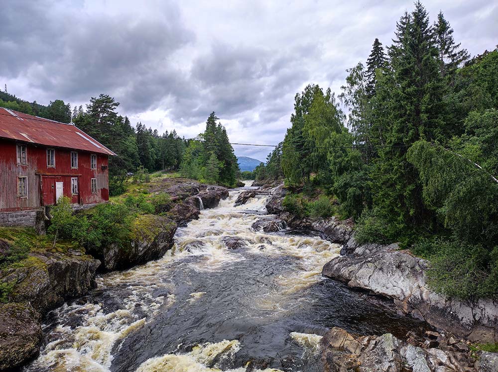 Bref, on s’est arrêtées quand même dégourdir nos papattes avec Faro à la cascade de Sauland puis nous nous sommes dirigées manger sur le parking de l’église en bois debout d’Heddal. Nous en aurons vu 2 sur les 28 restantes. Elle était très belle et imposante. Nous avons ensuite enfin trouvé une rando à Kongsbergveien qui nous a fait le plus grand bien un silence tellement agréable à écouter ça nous à regonfler à bloc. Ce soir, nous avons trouvé un parking au bord de l’eau dans tous les sens du terme car ce soir il flotte