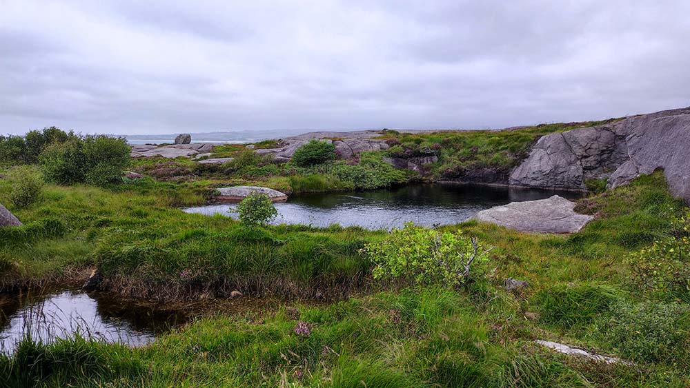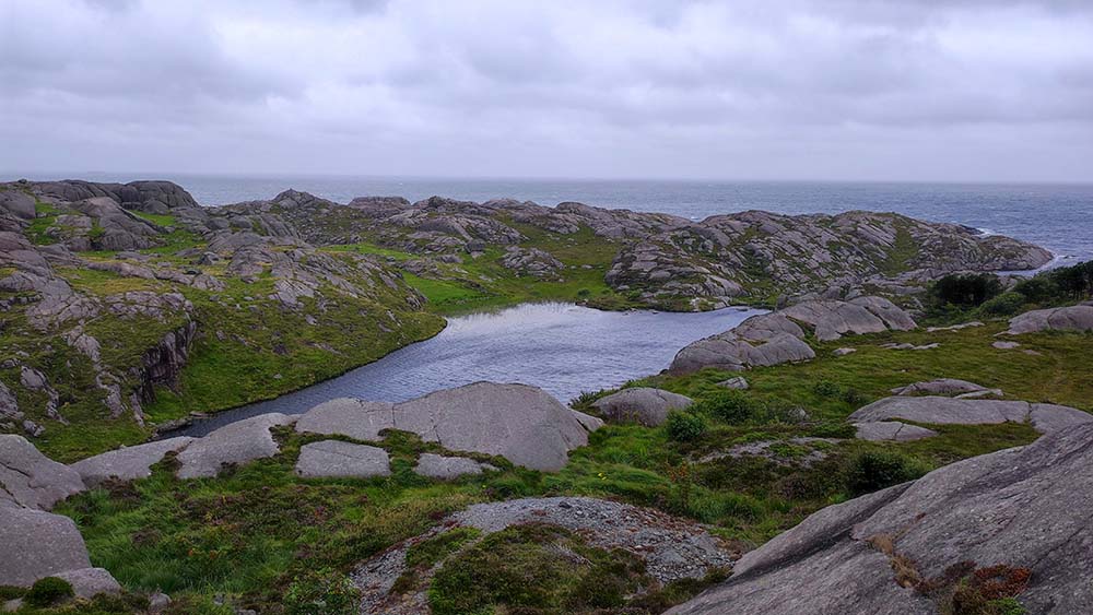 Après avoir regardé si la route allait être moins hard qu’hier à partir de Hauge, nous avons décidé ce matin de continuer sur la route panoramique 44 à travers un Magma Geopark et ses roches formées il y a 930 millions d’années. En effet, elle est nickel à partir de Hauge, elle est de largeur normale et beaucoup moins sinueuse donc je n’ai même pas eu à serrer les fesses. Notre première halte s’est faite à Sirevang à Krigsminnevandring et ses paysages lunaires. Malgré le temps couvert et laiteux, malgré le vent de dingue, nous sommes allées à la rencontre de ses énormes cailloux qui semblent tous lisses et polis par les intempéries. La vue tout en haut sur la mer est magnifique.