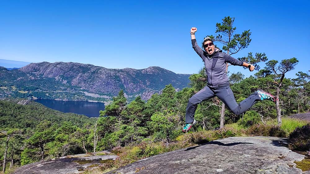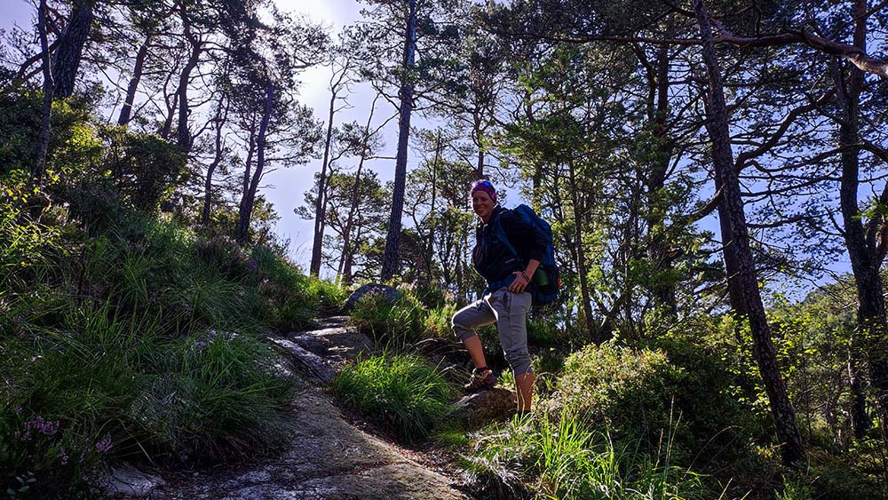 Nous nous sommes remises de notre montée d’adrénaline hier en arrivant sur le spot le long du Lysefjord. Le magnifique spectacle du coucher de soleil le soir et le calme ont tout fait oublier. Nous étions hyper bien placées ce matin pour aller faire une rando. Nous avons opté pour ne pas faire l’ascension du Preikestolen mais plutôt faire une randonnée ascensionnelle sur l’autre versant du fjord. Nous y étions seules avec une famille d’italiens loin du défilé de touristes de l’autre côté. C’était assez hard au début car les pierres étaient un peu glissantes mais ça a valu la peine. La vue dégagée sur le fjord était magnifique.