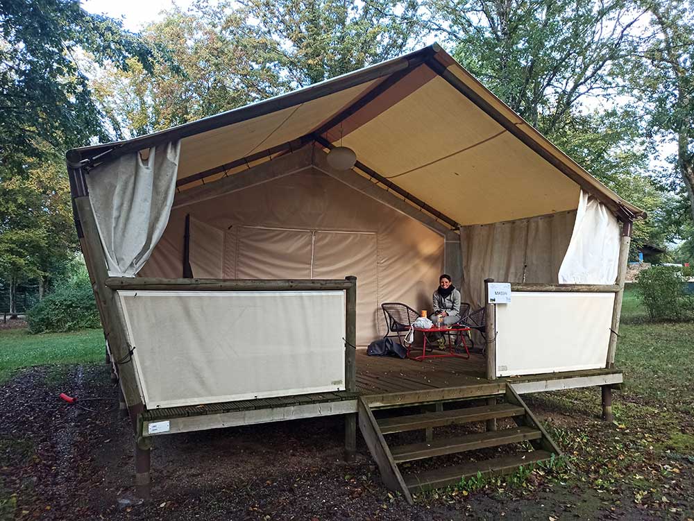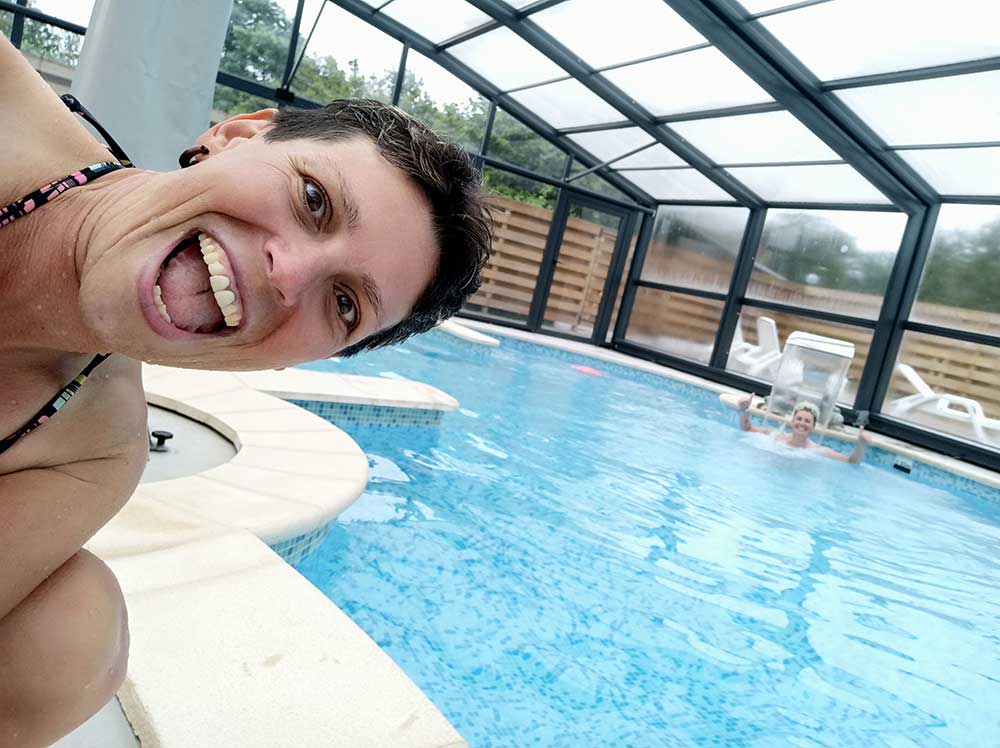 Départ à 8h55. On était bien au chaud sous la tente c’est pas la même dehors. On a mis toutes les couches que l’on pouvait. On croise les doigts pour ne pas avoir de pluie aujourd’hui. Nous sommes parties sur la route très optimistes et assez enjouées. Nous avons traversé des étangs, croisé des vaches, moutons et chevaux. Nous étions au top. Même l’arbre en plein milieu du chemin, nous obligeant à faire demi tour et le détour de 5 km pour trouver de la bouffe pour le soir (hé oui, nous n’avions pas calculer qu’on était dimanche et que ça allait être compliqué ce soir) ne nous ont pas ébranlés le moral. Y a des journée comme ça où ça roule, c’est le cas de le dire ! Nous avions toujours la pêche et le sourire.Ça n’a pas été la journée la plus folle du séjour côté visite. Mais avec les multiples poses pour mettre, retirer puis remettre la 3eme couche de fringues, parfois kway, parfois veste, pull, gants…. nous avons bien été occupées. Il faut voir le bon côté des choses, l’effet sauna sous ces diverses couches nous aura permis de perdre 2 à 3 kg (mieux que ww). Le brumisateur de pluie nous a donné un teint magnifique. Après 70 km sous ce brumisateur, nous avons eu le droit de franchir plusieurs magnifiques côtes à 16% avant d’arriver dans le camping le plus haut de Meurthe et Moselle. Mais heureusement, la piscine couverte chauffée n’attendait que nous et nos cuisses bien chaudes après 80km. Piscine privative. Ce soir, nous avons squatté la terrasse d’un tipi en location vide afin de nous faire des pâtes chaudes à l’abri du vent. On croise les doigts pour demain.