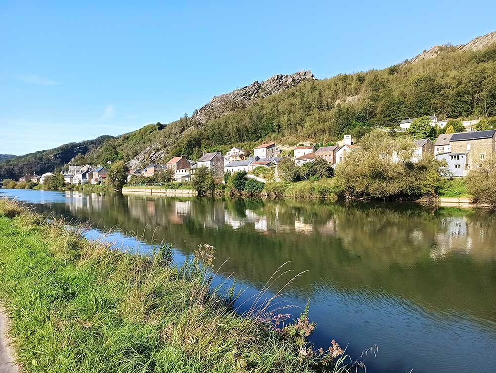 C’est fin de la 3ème semaine ce jour et pas des moindres avec 767 mètres de D+ pour 79 km. On comprend maintenant pourquoi il n’y a pas beaucoup de cyclistes par ici. De ce fait, les Ardennais semblent assez étonnés de nous voir passer et sont très sympas dès qu’on s’arrête pour nous donner des informations sur la route. Le paysage est magnifique par ici. Carte postale de « montagne » avec forêt, eau et récifs. Tous les paysages en un. Très chouette, nous avons bcp aimé s’y balader toute la matinée. Nous frôlons aujourd’hui la frontière Belge. Nous sommes presque arrivées à la maison. L’après-midi a pris une autre tournure. Nous avons attaqué un peu les grimpettes avant manger et ça a bien continué après. À la fin d’un virage, tu crois que c’est fini mais ça recommence sans cesse.