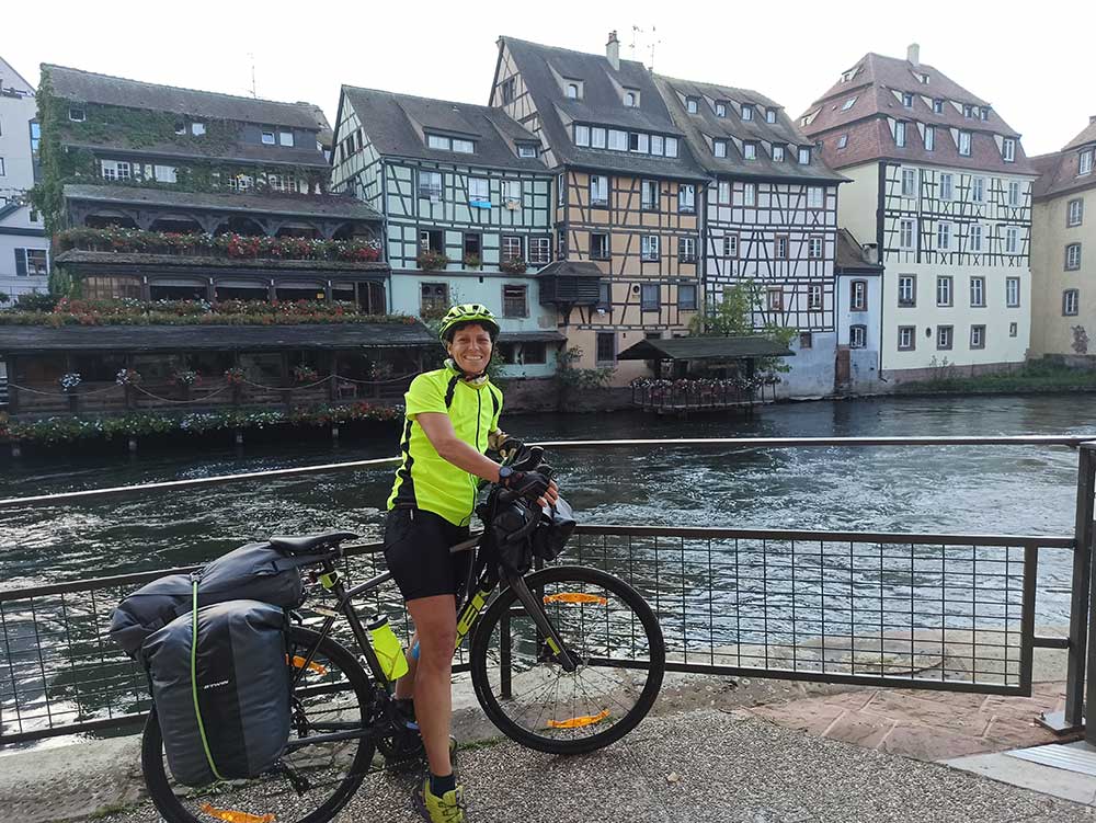 Peu de km aujourd’hui mais un peu de dénivelé et surtout visites de l’Alsace. On valide à 100%, c’est une très jolie région. Après une petite pluie fine au réveil, nous avons eu peur pour la journée mais dès le petit déjeuner avalé dans la tente, le soleil a pointé doucement le bout du nez et nous a permis d’avoir encore une journée géniale. Tout d’abord, direction ce matin à Colmar. Val n’y était jamais allée et n’a pas été déçue. Très jolie ville, bien fleurie avec de vielles ruelles typiques. On a adoré. Et ensuite direction Riquewihr et Ribeauvillé. Çà a bien grimpé sous le soleil, on en a bien ch…. dans les vignes.Mais l’arrivée dans ces deux villes en valait vraiment le coup. Sur le chemin, qui était quand même un peu hard par moment, Val en a profité pour faire des réserves de fruits en route.