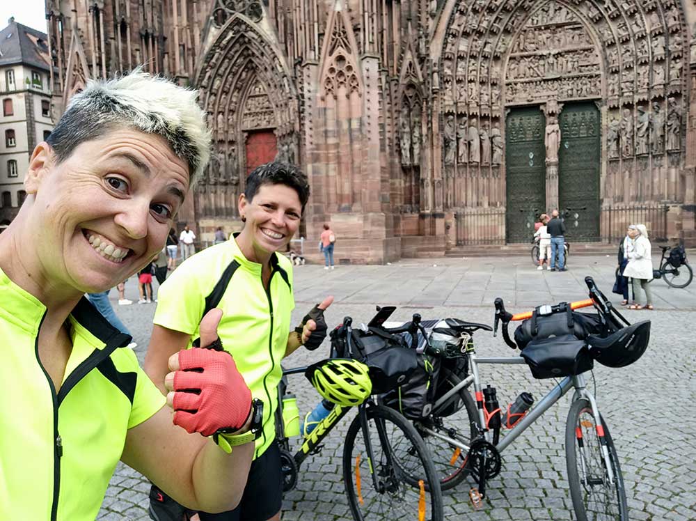 Tout d’abord, p’tit déj tranquilou au soleil au camping car peu de km à parcourir aujourd’hui. Ça fait du bien aussi de prendre son temps le matin surtout que le soleil était déjà au rendez-vous. En route vers Strasbourg !!! Nous avons d’abord eu une déviation qui a rallongé un peu le parcourir mais bon. Puis nous avons emprunté le canal du Rhône au Rhin accompagnées de cygnes et de hérons. Petit café posées avant d’attaquer l’arrivée en ville. On a adoré Strasbourg. C’est impressionnant le nombre de vélos, de pistes cyclables la bas, on se croirait à Amsterdam ! Visite de la ville à vélo : la petite France, les petites ruelles pavées pas forcément top à vélo puis la fameuse cathédrale. Val n’y était jamais allée et je lui ai gardé la surprise pour l’horloge astronomique impressionnante. Nous nous sommes posées ensuite un peu en terrasse en attendant notre hôte Judith. Nous avons été super bien accueillies chez elle. Nous avons passé une excellente soirée avec elle et sa fille et avons dégusté un bon plat de pâtes à l’italienne. Une bonne nuit là dessus et nous voilà reparties en direction de Gondrexange.