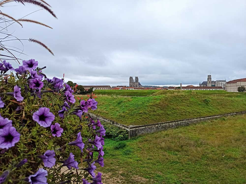 Le début de la journée fût entamé par ma 5ème chute à l’arrêt sur le côté à cause des pédales automatiques et ça à 3 m de notre tente. Mauvais début. Par contre ensuite ça a déroulé. Une journée comme on aimerait en avoir tous les jours. Nous avons fait de très belles rencontres de marcheurs sur le chemin. Nous avons eu de magnifiques grimpettes qu’on a parfois fait à pieds (13%) ce qui veut dire de super descentes de ouf. La première s’est faite juste après la sortie du camping, on a eu une descente de quasi 5km (c’est dire ce qu’on avait grimpé la veille pour arriver au camping) sans pédaler ce qui a lancé le défi de la journée à savoir faire le max de km sans donner un coup de pédale (on chantait sur notre vélo : » J’pédale pas, j’pédale pas « ).Nous sommes passées par Maron, un petit village avec un beau lavoir. Puis forêt domaniale de Haye tout tranquillou et enfin Toul et sa belle cathédrale.
