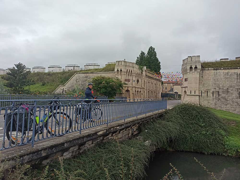 La 19 ème journée (85 km) ou la journée pas ouffissime Après un camping basket (je sais c’est pas bien mais bon, personne à notre arrivée et personne à notre départ, on a qu’à dire qu’on y était pas), direction lidl pour acheter du pain et viennoiseries car pas de gaz ce matin pour ce faire un petit café. La journée n’a pas commencé de façon follichonne ! S’en suit plus de 30km de nationale avant d’arriver enfin à Verdun. Petit centre sympa, on décide de s’y poser pour manger ce midi au soleil puis nous avons été contentes de retrouver le calme de la piste cyclable le long du Canal de la Meuse. Petites poses de temps en temps au soleil mais aussi à l’abri du vent (car il était assez froid aujourd’hui) pour soulager nos fesses douloureuses.